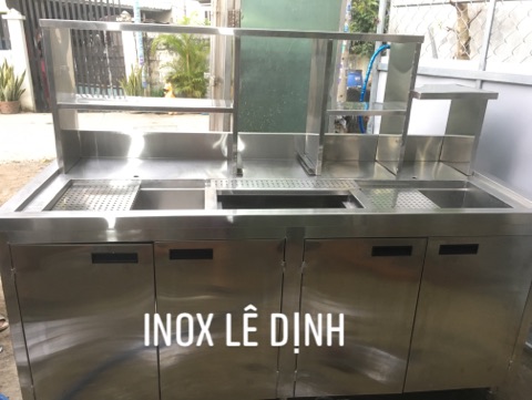 Bên cạnh đó, chúng tôi còn kết hợp khay đột lỗ trên mặt thùng đá, giúp cho người pha chế có thể tận dụng bỏ các vật dụng pha chế, đồng thời làm ráo chúng. Nước từ khay này sẽ nhanh chóng được thoát ra hai bên chậu rửa. Việc kết hợp 2 khay này đã tạo nên những tiện ích đáng kể trong pha chế, tiết kiệm được thời gian, chi phí.